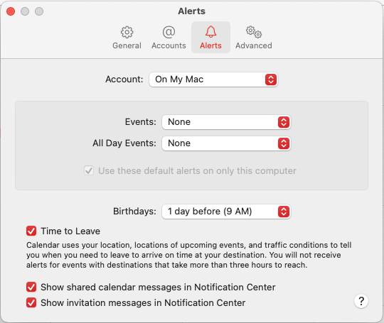 But my Mac always resets to this, not what I want. Checking the box for "...alerts on only this computer" has no effect.
