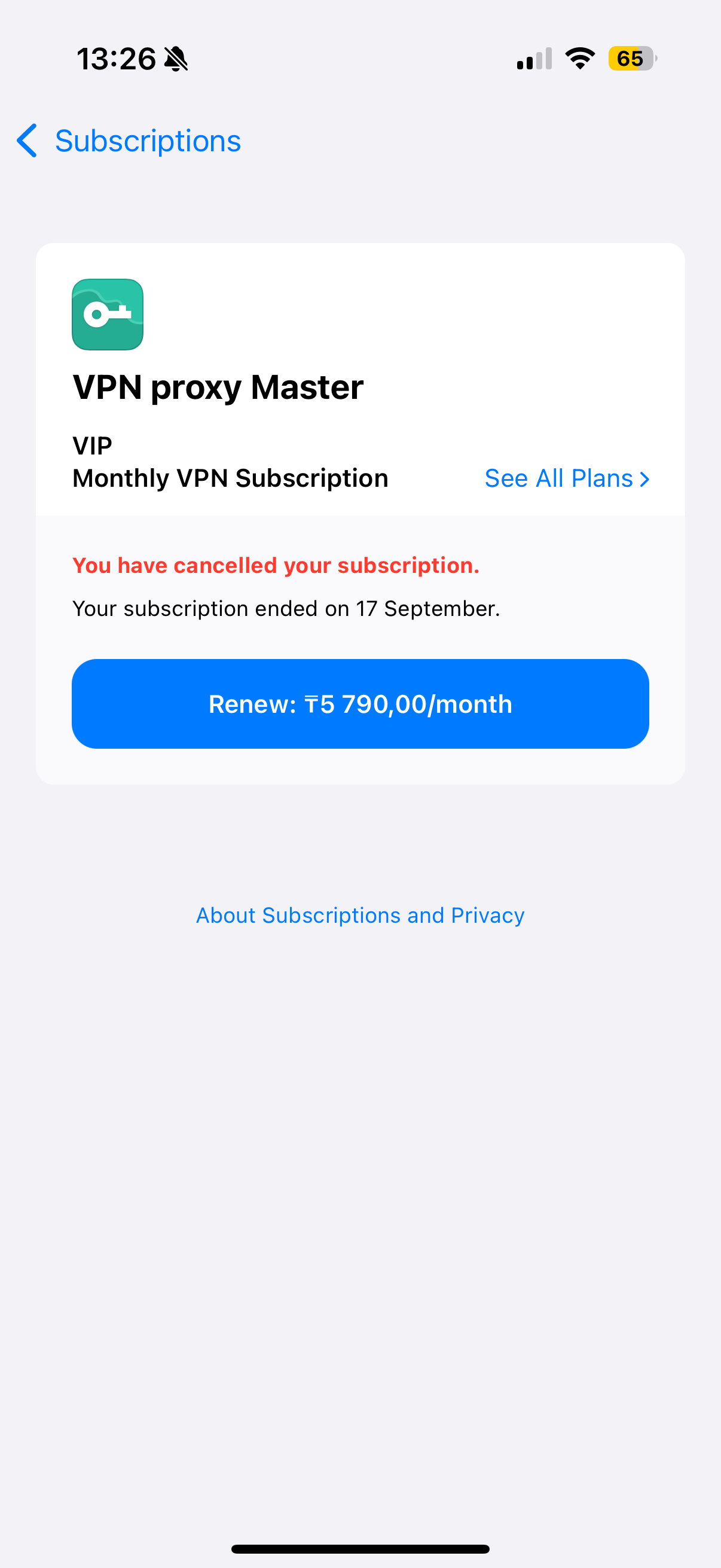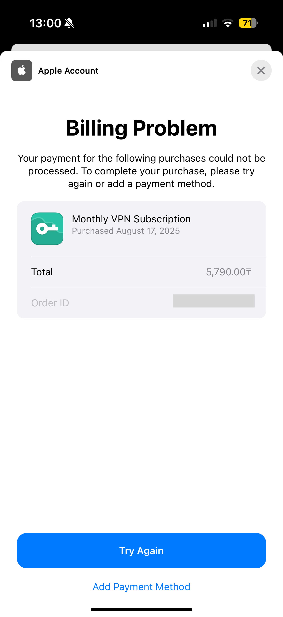 Hello! I accidentally signed up for a free trial of a VPN app and immediately canceled the subscription. But two weeks later, they're trying to charge me, and because of this, I can't download or update other apps. Please help. The app is listed as a "closed subscription" in my subscriptions.