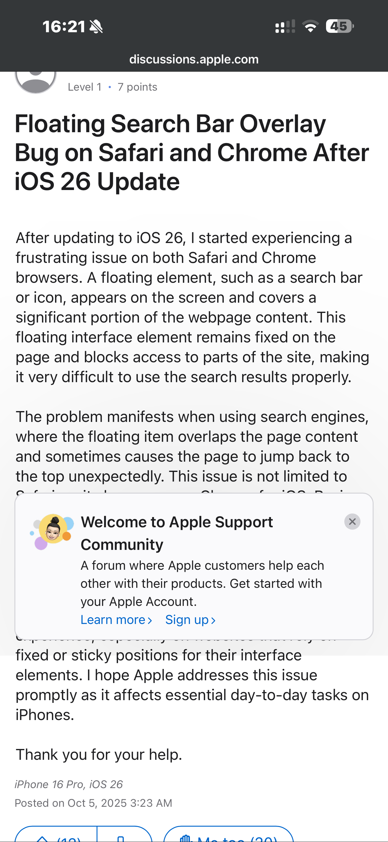 After updating to iOS 26, I started experiencing a frustrating issue on both Safari and Chrome browsers. A floating element, such as a search bar or icon, appears on the screen and covers a significant portion of the webpage content. This floating interface element remains fixed on the page and blocks access to parts of the site, making it very difficult to use the search results properly.