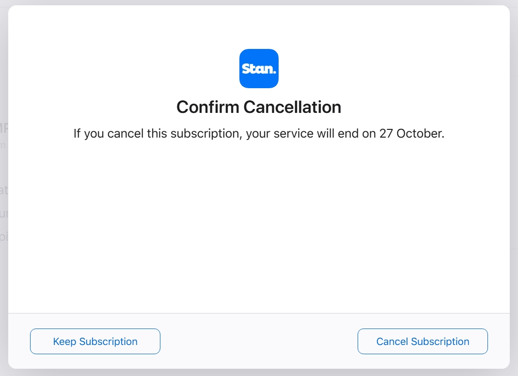 I am trying to cancel my monthly subscription to Stan via manage subscriptions in Apple. I can get to the box with the button to confirm the cancellation and it doesn't do anything. I've tried directly within the Stan platform & it says my subscription is managed by Apple & to do the cancellation there.