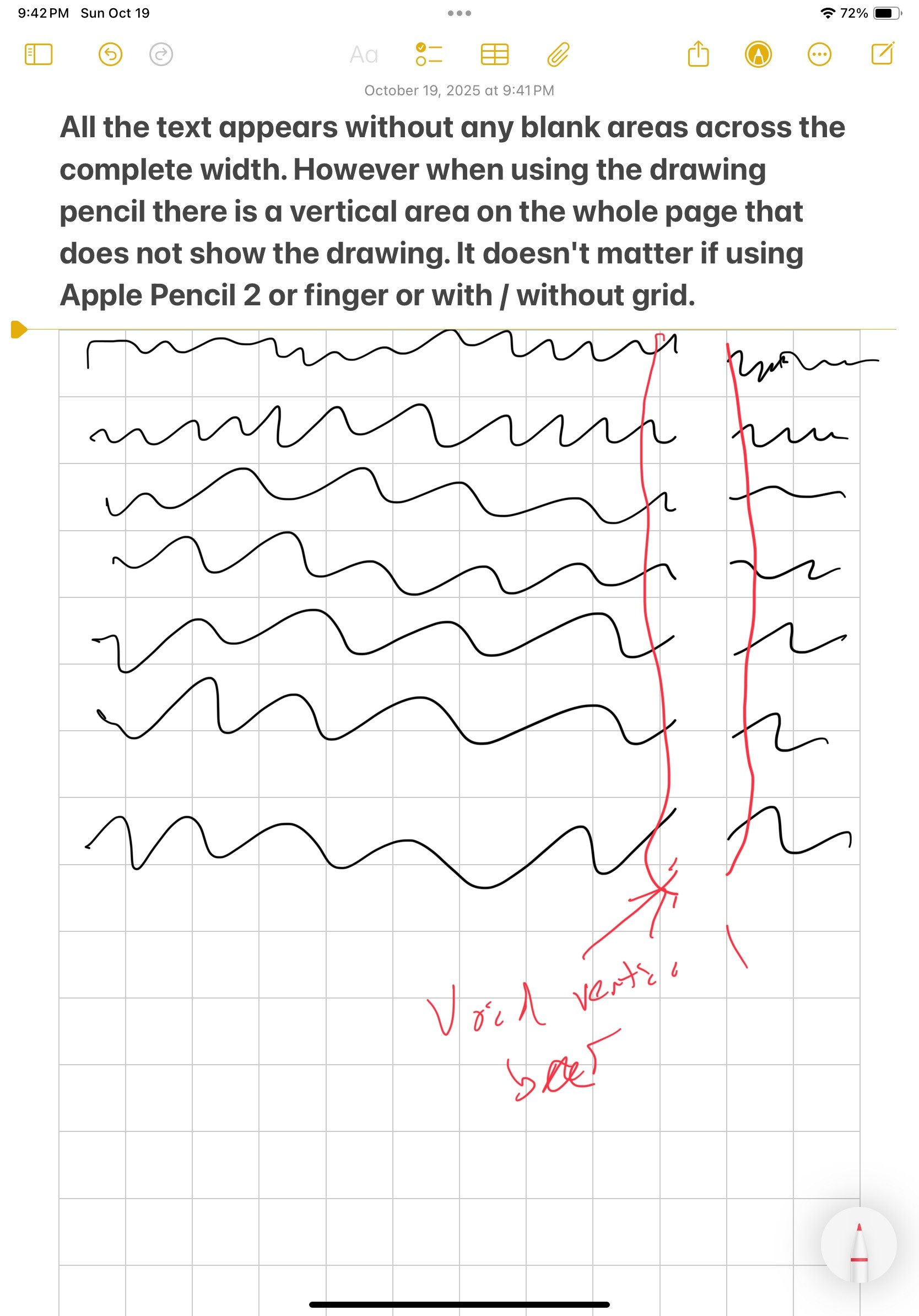 This happens when creating any new Note. If I open the same note on my iPhone Apple Notes, I can draw over this "void" area and it will be displayed properly. I tried to remove iPad Apple Notes app and reinstall but the same issue. Here is a screen shot from the iPad Apple Notes of the issue. I added the grid to highlight the issue but it doesn' matter if it is there or not. The iPad is an iPad Pro (11-inch); iPadOS Version 18.3.2