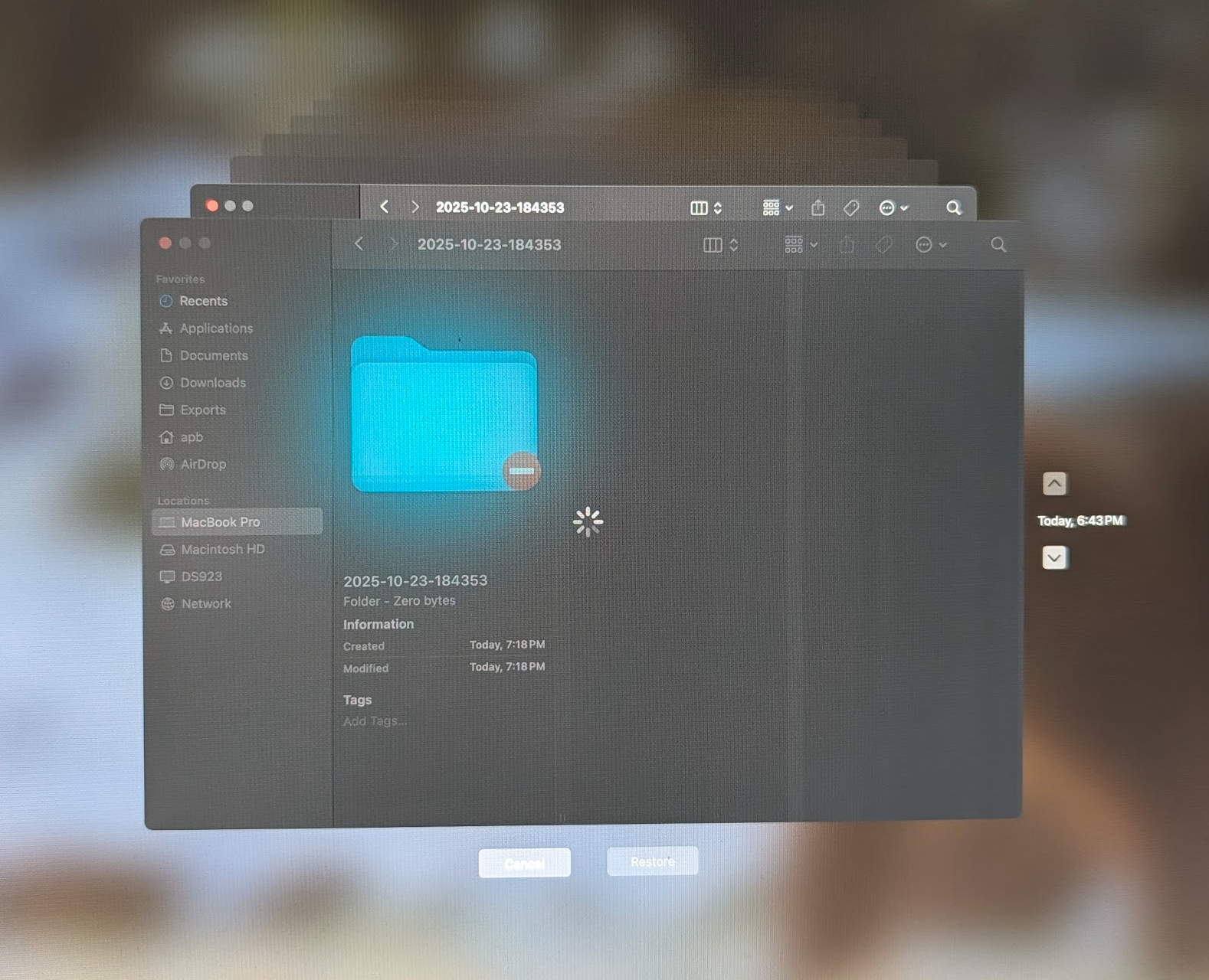 I recently purchased a Synology 923+ NAS and followed the company's instructions to set up Time Machine - https://kb.synology.com/en-us/DSM/tutorial/How_to_back_up_files_from_Mac_to_Synology_NAS_with_Time_Machine. The backups appear to be working fine, but the issue is that I'm unable to restore from them. I just get a white spinning wheel and the 'Restore' button never becomes clickable, as seen here: