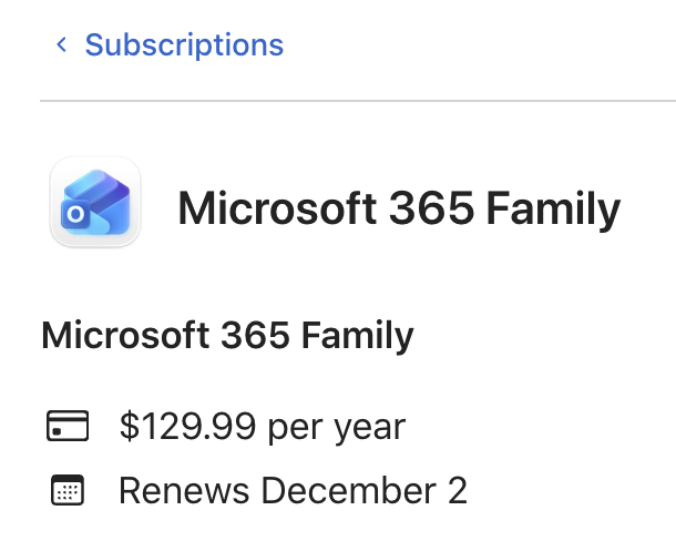 I purchased Microsoft 365 family subscription through the app store. I bought a new mac and can't install the subscription after logging in to my apple account and going to the app store. The app stores shows the individual apps for download, but not the subscription package. When I go to my Apple account the subsciption is there.