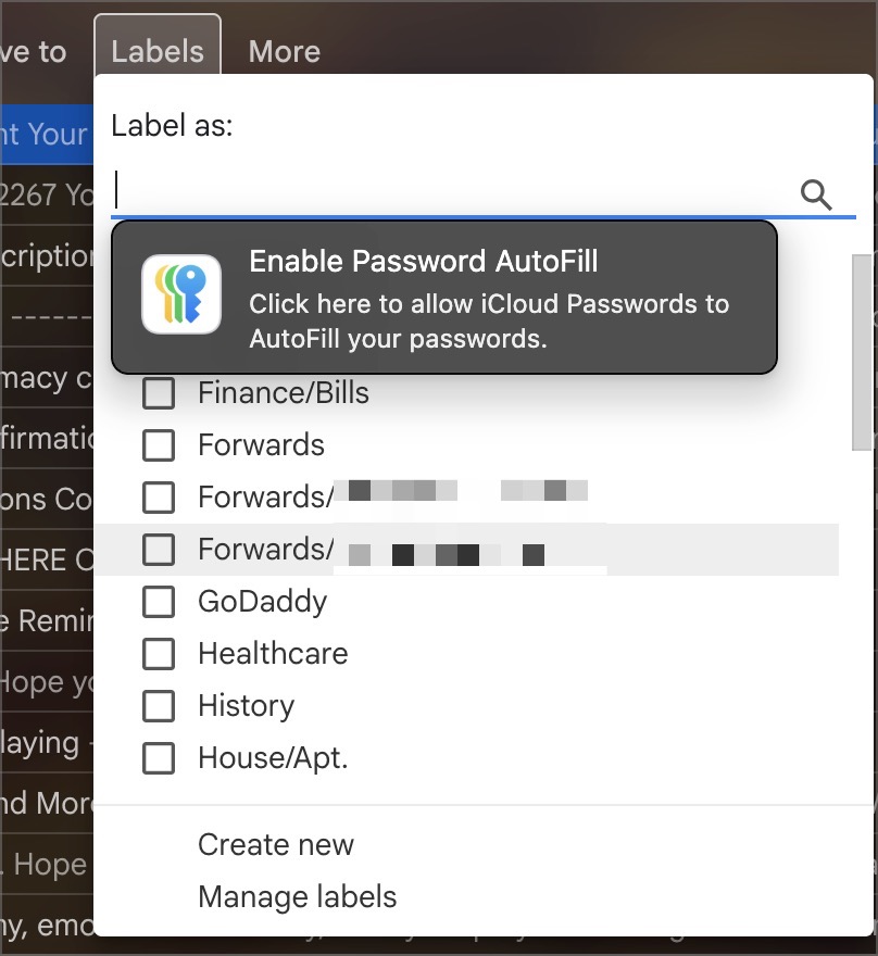 In gmail, when i want to tag an email, passwords pops up and obscures my view of the tags list. It's not a password fields but it pops up anyway. how to fix before just trash Passwords altogether?