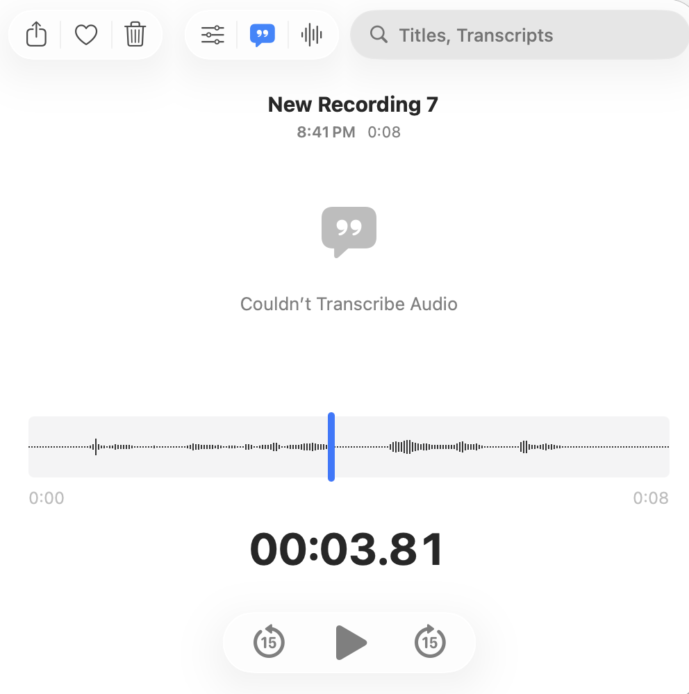 In the Voice Memos app, I can record audio, and playback sounds fine, but transcription does not work. It only gives the error message below, "Couldn't Transcribe Audio" with no other details.