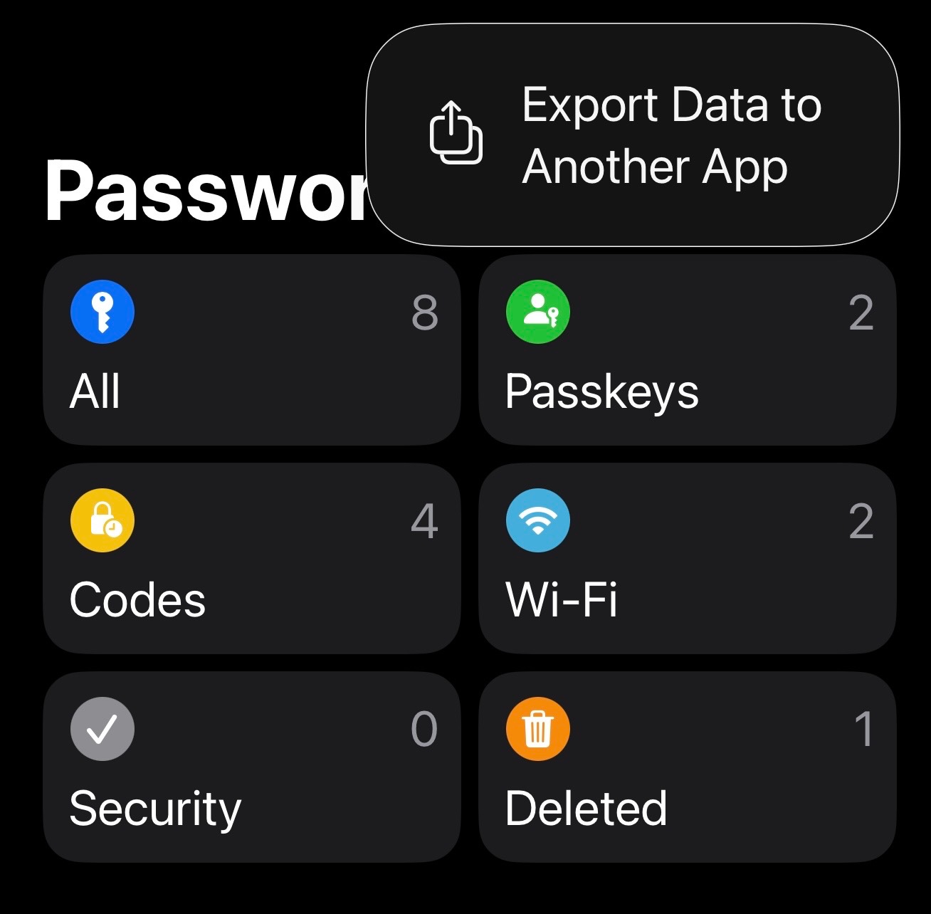 Please does anyone know how to export Password app data to a file on IOS 26.1 or 26.2 without using Safari ?