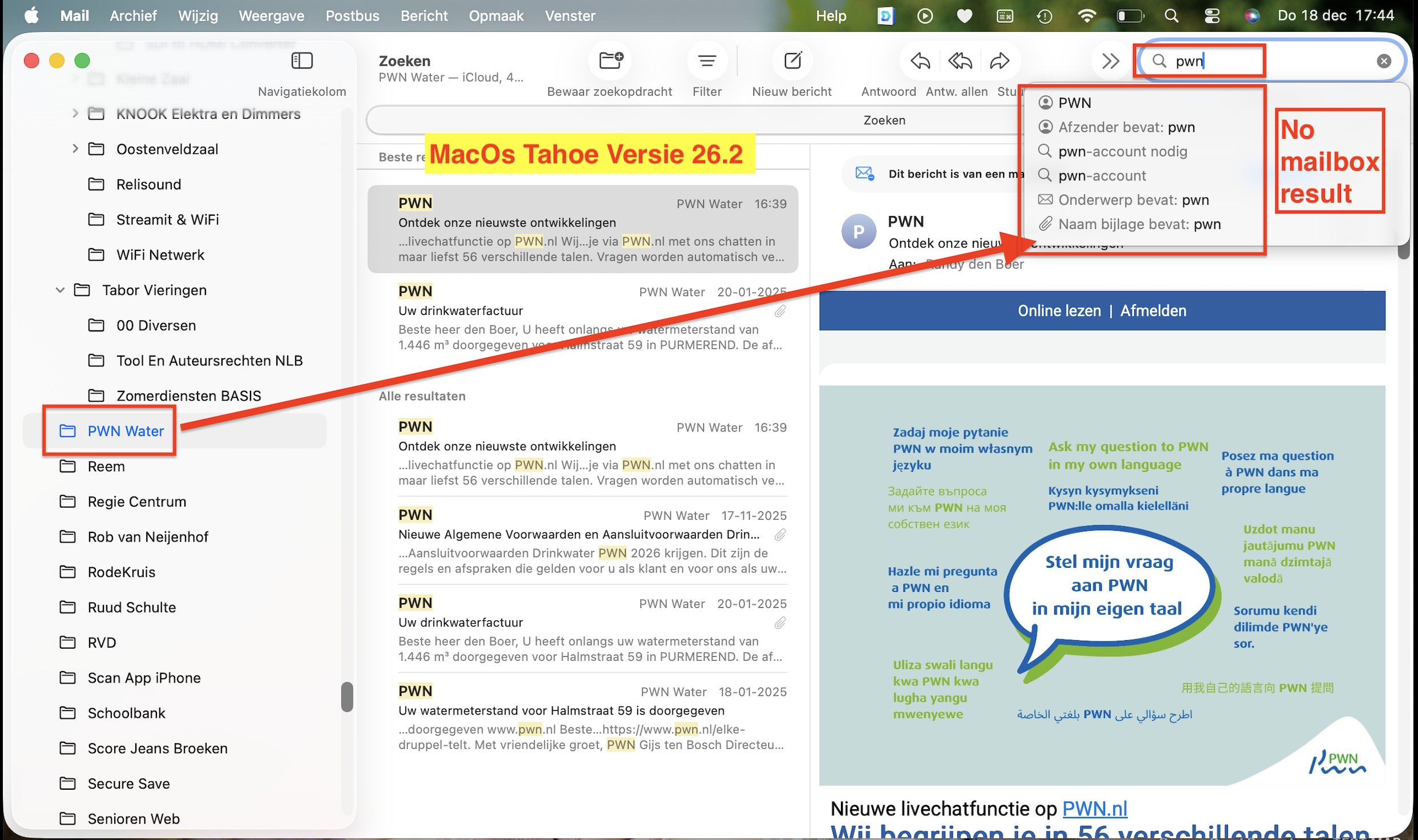 When I search for a specific mailbox with the same name as the search query in my email, I see the emails related to the mailbox name, but the mailbox itself doesn't appear in the search results. I do see it on my old MacBook Pro with BigSur.