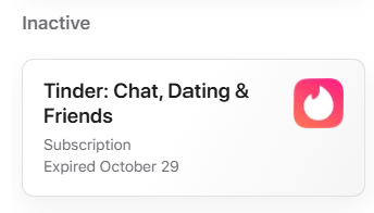 "Inactive" Tinder Gold subscription keeps renewing. It shows as an inactive subscription as of Oct 29. I renewed it three weeks ago just to use for one week. Went to cancel it right away, so it wouldn't auto-renew and it was already showing as Inactive. I have been billed for the subscription for the last two weeks and I cannot figure out how to cancel it