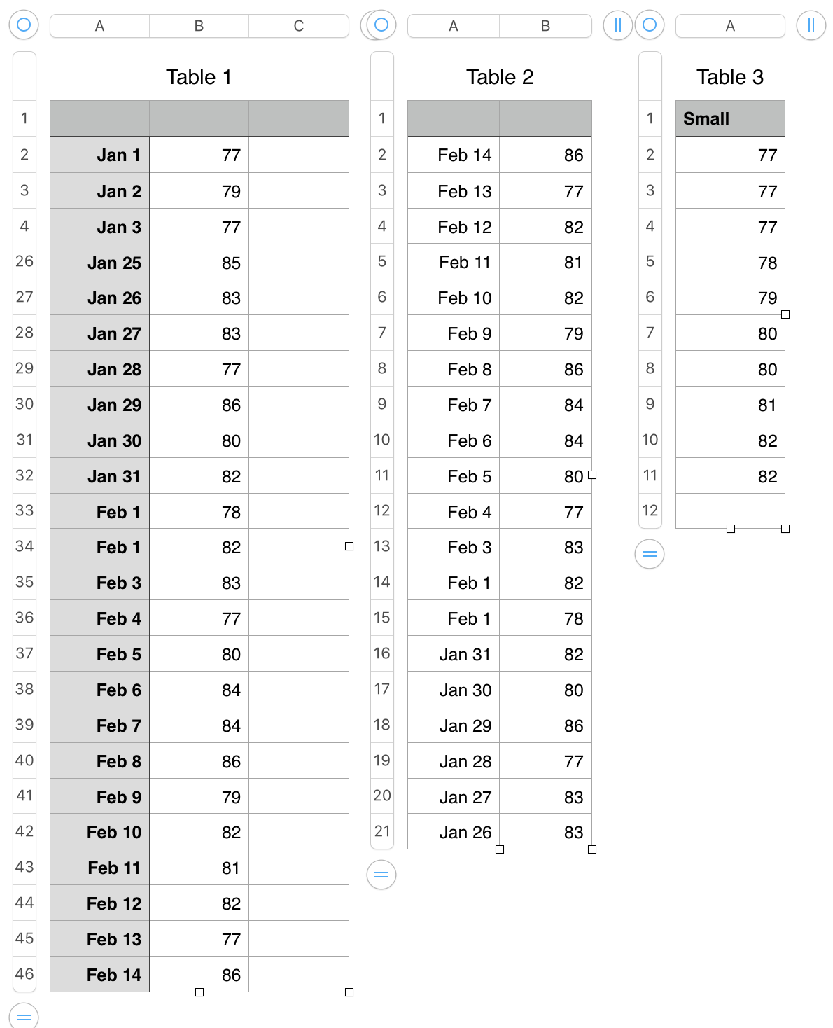Note: In the example, the 'dates' for the two rounds on Feb 11 were entered on Table 1 as Feb 1, and Feb 1, with the D&T value edited to Feb 11, 2019 01:00. Setting a time later than 00:00:00 for the second appearance of that date makes the two date & Time values distinct, and lets both be captured in the 'most recent 20'.