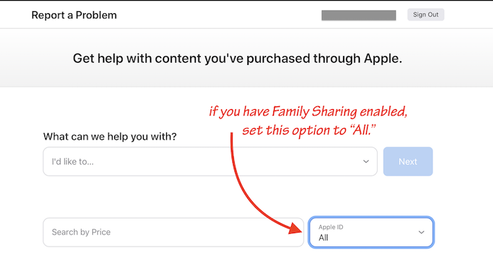 ⚠️ Important note for reviewing your Apple purchase history: If you are using Family Sharing, make sure you set the "Apple ID" box to the "All" option to get a full history of all purchases Apple shows as made from your account: