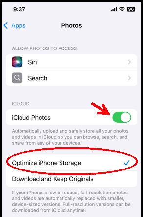 A different way to save space on your phone, without removing any pictures, is to use Optimize Storage. Optimize Storage saves space on your phone by keeping only smaller pictures there, and relying on the full files being kept at iCloud Photos. This way you can quickly scroll through all your pictures, even though they don’t take up so much space. Then, when you need the full pictures for printing or editing, etc, the phone grabs the full file from iCloud. This is very cool, but it does require internet connection to edit pictures. With Optimize Storage, you can save more than 90% of the storage that Photos would use otherwise.